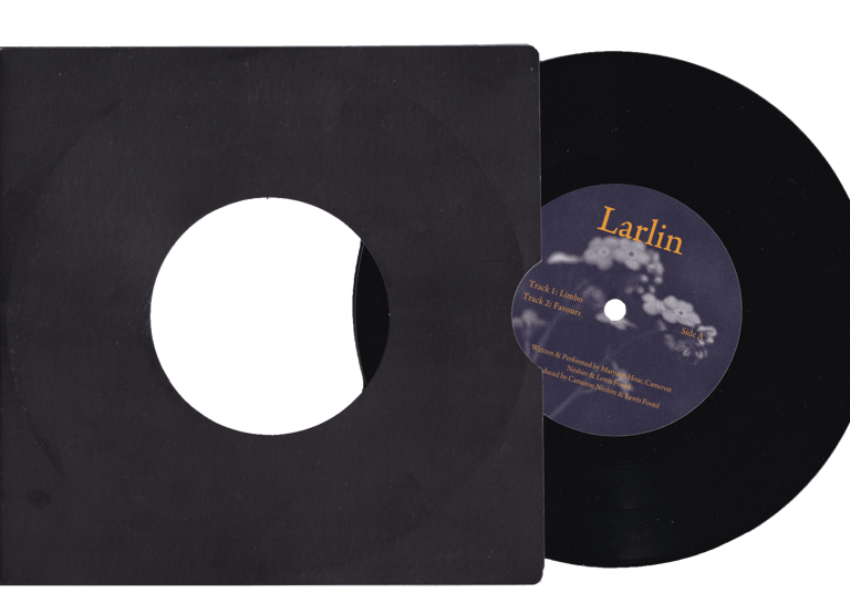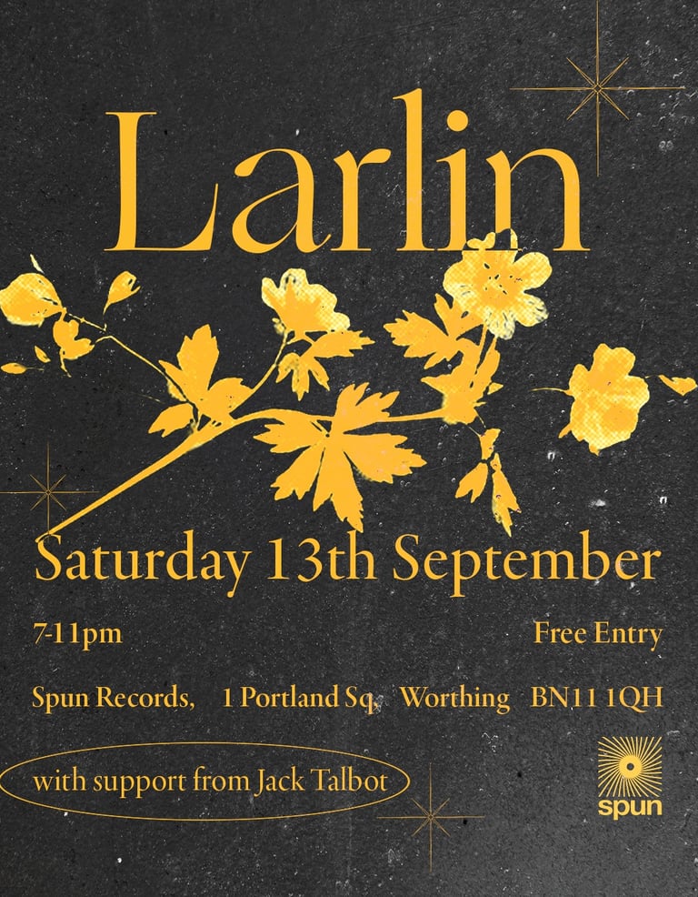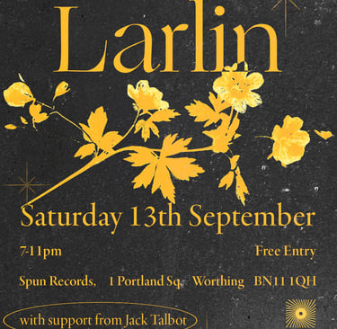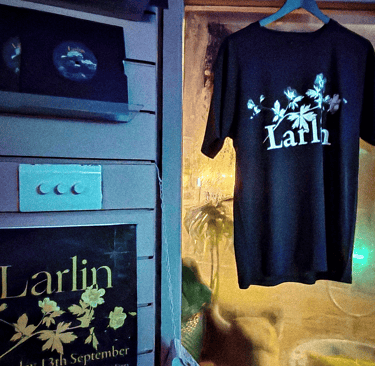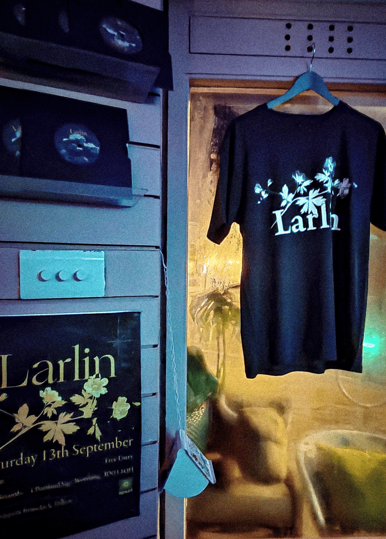 I developed a cohesive visual identity for Larlin’s live performance, producing a poster, 7-inch record centre design, and T-shirt. The consistent style across these elements created a strong and recognisable look, which was showcased in the Spun Records window during the event.